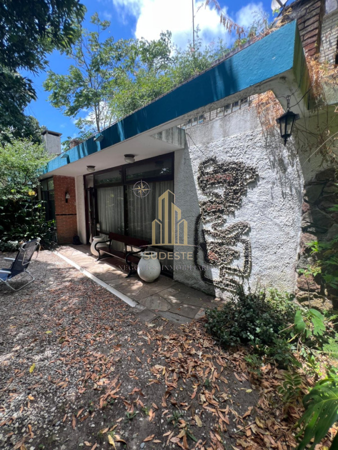 El terreno de 600 m² cuenta con un encantador parque al frente, con robles y árboles frutales, generando un entorno verde y privado. Un camino empedrado conduce a una sólida construcción de materiales nobles, desarrollada en dos plantas independientes.